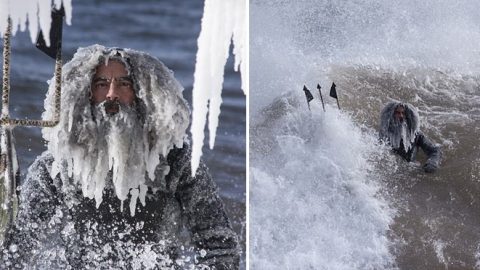 โพไซดอนจริงๆ? ภาพถ่ายอันน่าเหลือเชื่อของ 2 นักโต้คลื่น มือถือตรีศูล มีเคราน้ำแข็งยาวเฟื้อย ยืนท่ามกลางท้องทะเลแห่งความหนาวเหน็บ