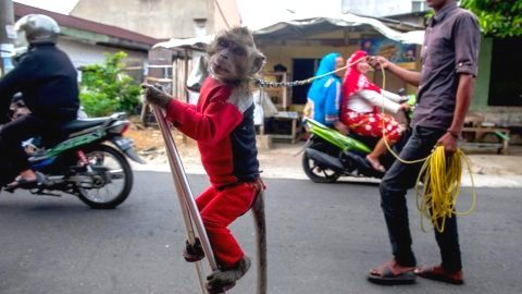 นักสิทธิสัตว์ เรียกร้องยุติความโหดเหี้ยม การล่ามโซ่ลิงและบังคับให้เดินบนเสา ขี่สกูตเตอร์ และสวมหน้ากากโทเท็ม
