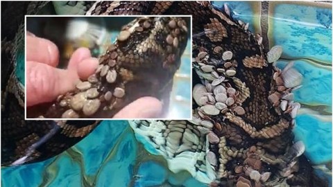 เห็นแล้วรู้สึกขนลุก!! พบงูหลามคาร์เพ็ตโดนเห็บกว่า 500 ตัวรุมเกาะดูดเลือด