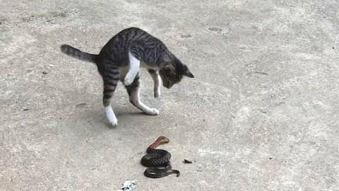 นาทีระทึก! แมวน้อยใจกล้าบุกตบงูมีพิษ ที่แอบเลื้อยเข้าบ้านแบบไม่กลัวตาย (มีคลิป)