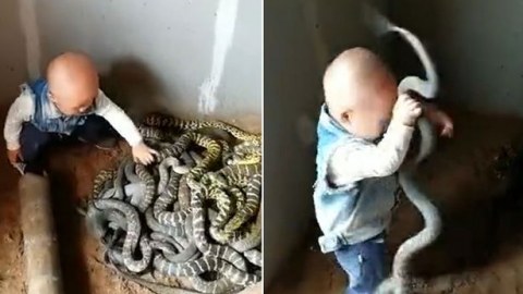 สุดหวาดเสียว! หนูน้อยวัยหัดเดินเล่นกับงูนับสิบ..แบบไม่สะทกสะท้าน (มีคลิป)
