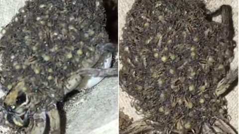 ดูกันชัดๆ ลูกแมงมุมหมาป่านับร้อยตัวกำลังเกาะยั้วเยี้ยเต็มหลังแม่แมงมุม ดูแล้วชวนขนลุกสุดๆ (มีคลิป)