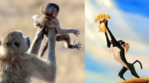 ความบังเอิญที่น่ามหัศจรรย์!! ช่างภาพชาวอิสราเอล โชว์ภาพถ่ายลิงบาบูนตัวผู้กำลังชูลูกลิง คล้ายกับกับฉาก "ซิมบ้า" ในเดอะไลอ้อนคิง