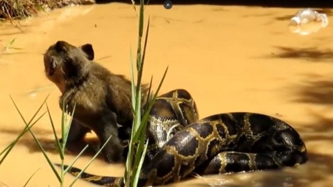 วินาทีชีวิต! ลิงน้อยหวิดโดนไอ้หลามยักษ์เขมือบ โชคดีถูก 2 เด็กชายช่วยเหลือทัน (มีคลิป)
