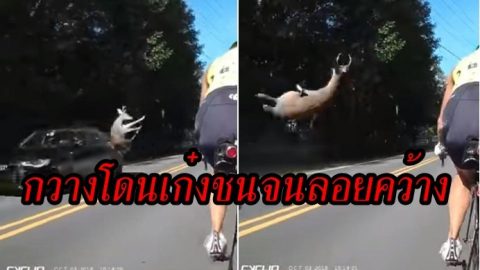 วินาทีสุดช็อก!! นักปั่นจักรยานเจอกวางโดนเก๋งชนจนลอยคว้าง ก่อนกระแทกพื้นอย่างแรง (มีคลิป)