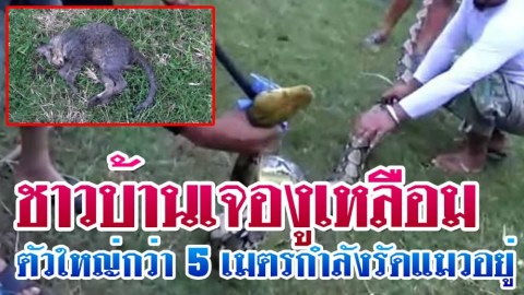 ชาวบ้านช็อคเจองูเหลือมตัวใหญ่ยาวกว่า 5 เมตรกำลังรัดแมวอยู่