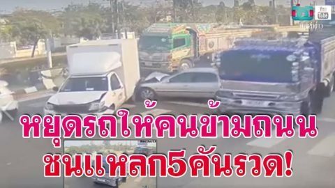 หยุดรถให้คนข้ามถนน ชนเเหลก5คันรวด!