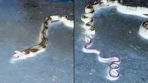 วินาทีชวนขนลุก ชายอินเดียเจองูตัวใหญ่นอนนิ่งอยู่หน้าบ้าน แต่ถึงกับอึ้งเมื่อเห็นสิ่งที่มันขย้อนออกมา (มีคลิป)