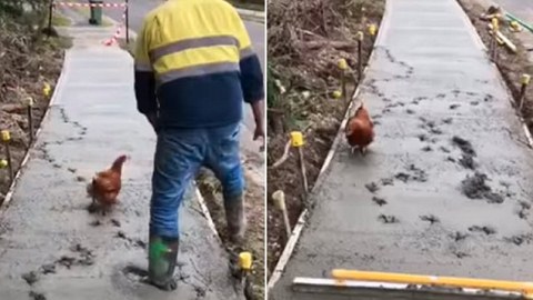 น่าจับไปทำไก่ต้มซะจริงๆ! เจ้าไก่ตัวแสบป่วนงานคนทำถนน ฝากรอยเท้าซะเละเทะ (มีคลิป)