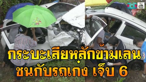 กระบะเสียหลักข้ามเลน !!!! ชนกับรถเก๋ง เจ็บ 6 ราย