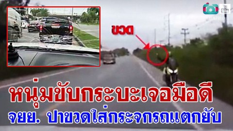 หนุ่มขับกระบะเจอมือดี จยย. ปาขวดใส่กระจกรถแตกยับ