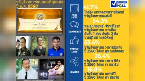 ‘ซูเปอร์โพล’เผยปชช.79ล.ระบุ’บิ๊กตู่-ตูน’ขวัญใจมหาชนแห่งปี 60 ส่วน บิ๊กป้อม ตามติด