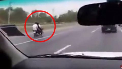 ตะลึง !!! เด็กนักเรียนสุดห้าว ขี่มอเตอร์ไซค์ซ้อนสามบนถนนมอเตอร์เวย์