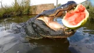 มาดูกันว่า ถ้าจระเข้กัดหัวเรา จะเป็นยังไง โดยโยนลูกแตงโมขนาดเท่าหัวคนให้มันขย้ำ