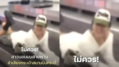 สาวนอนบนสายพานโหลดกระเป๋าในสนามบิน แถมยิ้มร่าให้กล้องอย่างภูมิใจ