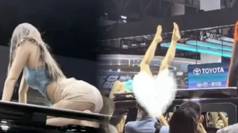 นางแบบปีนขึ้นไปบนหลังคารถทำท่าทางยั่วยวน ผู้ชมในงานต่างหยิบมือถือขึ้นมาถ่ายกันอย่างคึกคัก