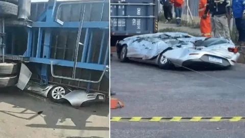 รถบรรทุกคอนเทนเนอร์พลิกคว่ำในบราซิล รถยนต์ถูกทับทำให้คนขับเสียชีวิต