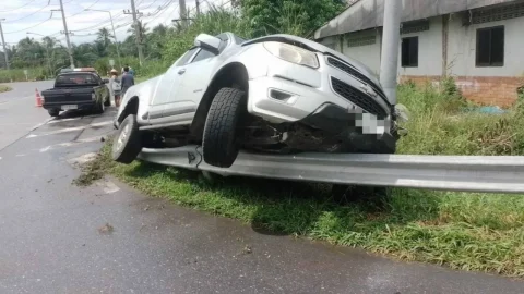 จยย.- กระบะลื่นถนนปีนราวเหล็กริมถนน รถพัง คนเจ็บ