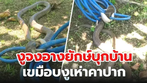 สาวใหญ่ผงะ! งูจงอางยักษ์บุกบ้าน เขมือบงูเห่าคาปาก