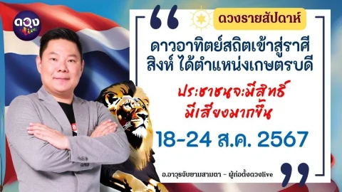 ดวงรายสัปดาห์ประจำวันที่ 18 -24 สิงหาคม 67 ดาวอาทิตย์สถิตเข้าสู่ราศีสิงห์ ได้ตำแหน่งเกษตรบดี ประชาชนจะมีสิทธิ์มีเสียงมากขึ้น อ.อาวุธจับยามสามตา – ผู้ก่อตั้งดวงlive