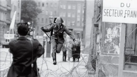 กระโดดสู่เสรีภาพ ทหารเยอรมนีตะวันออกกระโดดข้ามรั้วลวดหนามหนีไปเยอรมนีตะวันตก