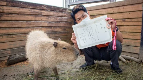 แข่งขันกินแตงโมของคาปิบารา ความน่ารักในญี่ปุ่น