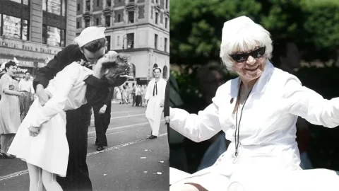 V-J Day ในไทม์สแควร์ เฉลิมฉลองการสิ้นสุดของสงครามโลกครั้งที่สอง