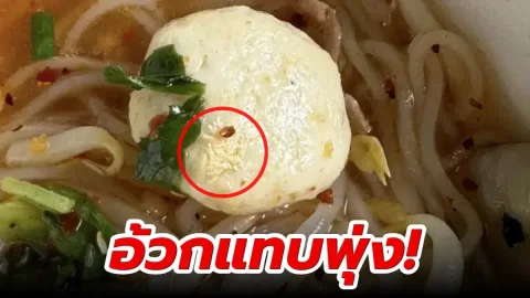 อ๊วกแทบพุ่ง หนุ่มกินก๋วยเตี๋ยว เจอสิ่งแปลกปลอมบนลูกชิ้นคล้ายไข่แมลงวัน