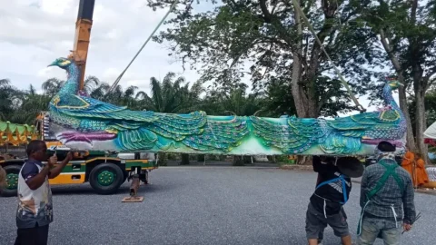 คอหวยส่องเลข!พิธีอัญเชิญ “พญามยุรีศรีวิชัยไตรโลกนาถ “ประดิษฐานหลังคาโบสถ์