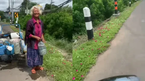 ฝีมือยายเอง!! คุณยายปลูกดอกไม้ริมถนนสีสันสวยงาม แถมยังขนน้ำมารดเองด้วย น่ารักจัง