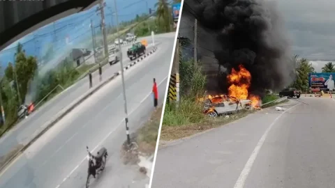 เก๋งเสียหลักชนเสาไฟฟ้าไฟลุกท่วมไหม้วอด คนขับรอดหวุดหวิด
