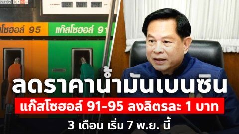 ลดราคาน้ำมันเบนซิน แก๊สโซฮอล์ 91 และ 95 ลงลิตรละ 1 บาท รวม 3 เดือน เริ่ม 7 พ.ย. นี้