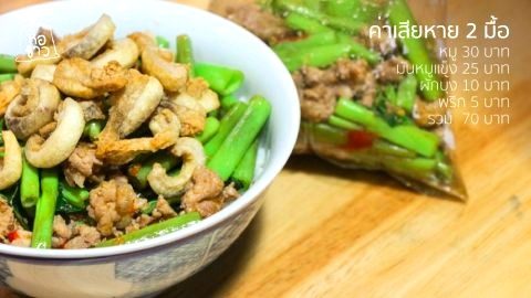 ผัดผักบุ้งแก้วกากหมูอู๋อู๋ กากหมูจุใจ มื้อละ 35 บาท