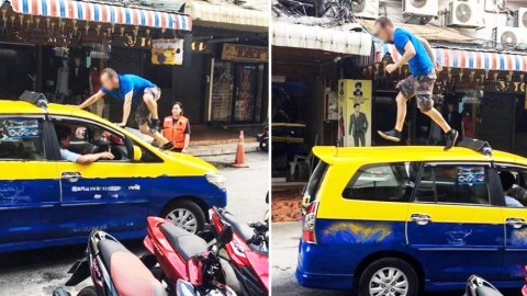 "ก่อความวุ่นวาย" ฝรั่งปีนขึ้นรถแท็กซี่ซะงั้น