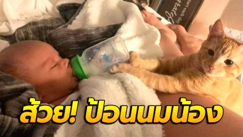 เหนื่อยมากแล้วนุด! "แมวส้ม" ช่วยถือขวดนมให้หนูน้อย หลังคุณแม่เพลียเผลอหลับไป