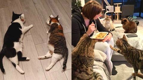 ทาสหัวจะปวด! รับ "แมวขาวดำ" ตัวใหม่มาเลี้ยงจากศูนย์พักพิง แต่กับสอนแมวในบ้านนอนกินข้าว จนพุงออกทั้งคู่
