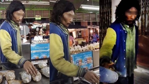 คนเร่ร่อน แม่ค้าให้หยิบกินได้ เขายังไม่กล้าที่จะหยิบ ...และหยิบไปแค่พอกิน