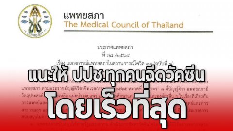 แพทยสภา แถลงการณ์ แนะให้ ปปช.ทุกคนฉีดวัคซีน ไม่ว่าชนิดใดโดยเร็วที่สุด