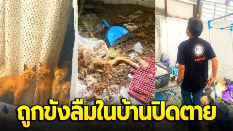 แมวส้มนั่งตาละห้อย เกาะประตูรอคนช่วย ถูกขังลืมในบ้านปิดตาย
