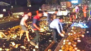 รถขนแคนตาลูปพลิกคว่ำเกลื่อนถนน ชาวบ้านแอบขโมยเก็บกลับบ้านเพียบ