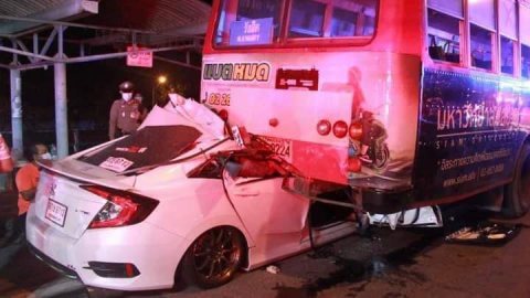 หนุ่มขับเก๋งชนอัดท้ายรถโดยสารประจำทาง