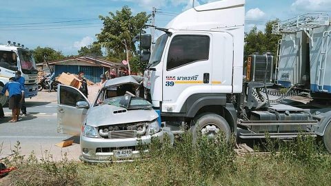 อุบัติเหตุ รถบรรทุกสิบล้อพ่วงชน ชนปะทะ รถยนต์กระบะ