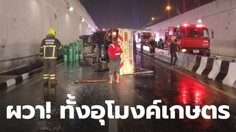 ผวา!! รถบรรทุกแก๊สคว่ำ กลางอุโมงค์เกษตร