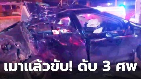เมาแล้วขับ! ซิ่งเก๋งชนเสาไฟฟ้า รถพลิกคว่ำคนกระเด็นออกมานอกรถตาย 3 ศพ ส่วนคนขับรอด