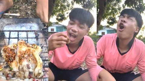 หนุ่มย่างหมูกิน พอเอาเข้าปากเท่านั้นแหละ แทบดุ้ง