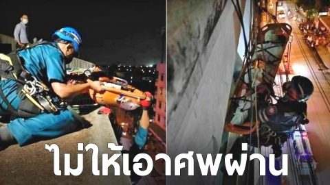 กู้ภัย แชร์ภาพเคลื่อนย้ายศพแบบทุลักทุเล โรยตัวจากชั้นดาดฟ้า เหตุ เจ้าของไม่ให้เอาศพผ่านลงมา