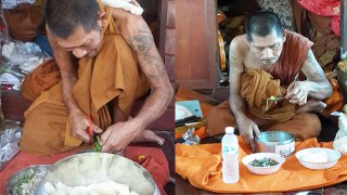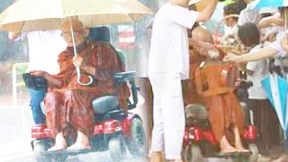 ชาวพุทธสาธุที่ได้เห็นหลวงปู่อว้าน เขมโก 81 ปี แห่งวัดป่านาคนิมิตต์ ออกบิณฑบาตยามเช้า ขณะอาพาธนั่งรถเข็น