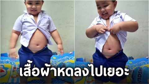 น่ารักน่าเอ็นดูสุดๆ!! แม่ลองชุดให้ลูกชายก่อนเปิดเทอม เสื้อผ้าหดลงไปเยอะ
