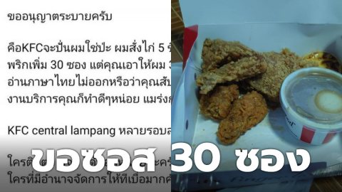 หนุ่มขอระบาย ไม่พอใจ สั่งไก่ 5 ชิ้นขอซอส 30 ซอง แต่ได้มาแค่ 3 ซอง