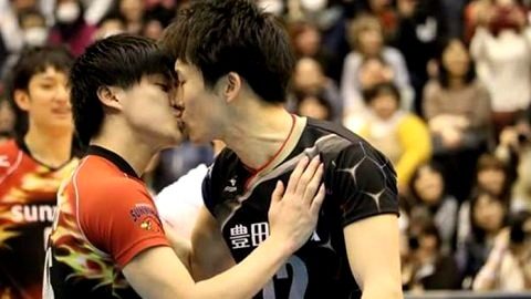 สองนักวอลเลย์บอลชาย ทาคามัตสึ กับ ยามาโมโตะ ในการแข่งขันวอลเลย์บอล V-League All Star Game ระหว่างทีม Fukkachan VS Buiri ที่ญี่ปุ่น